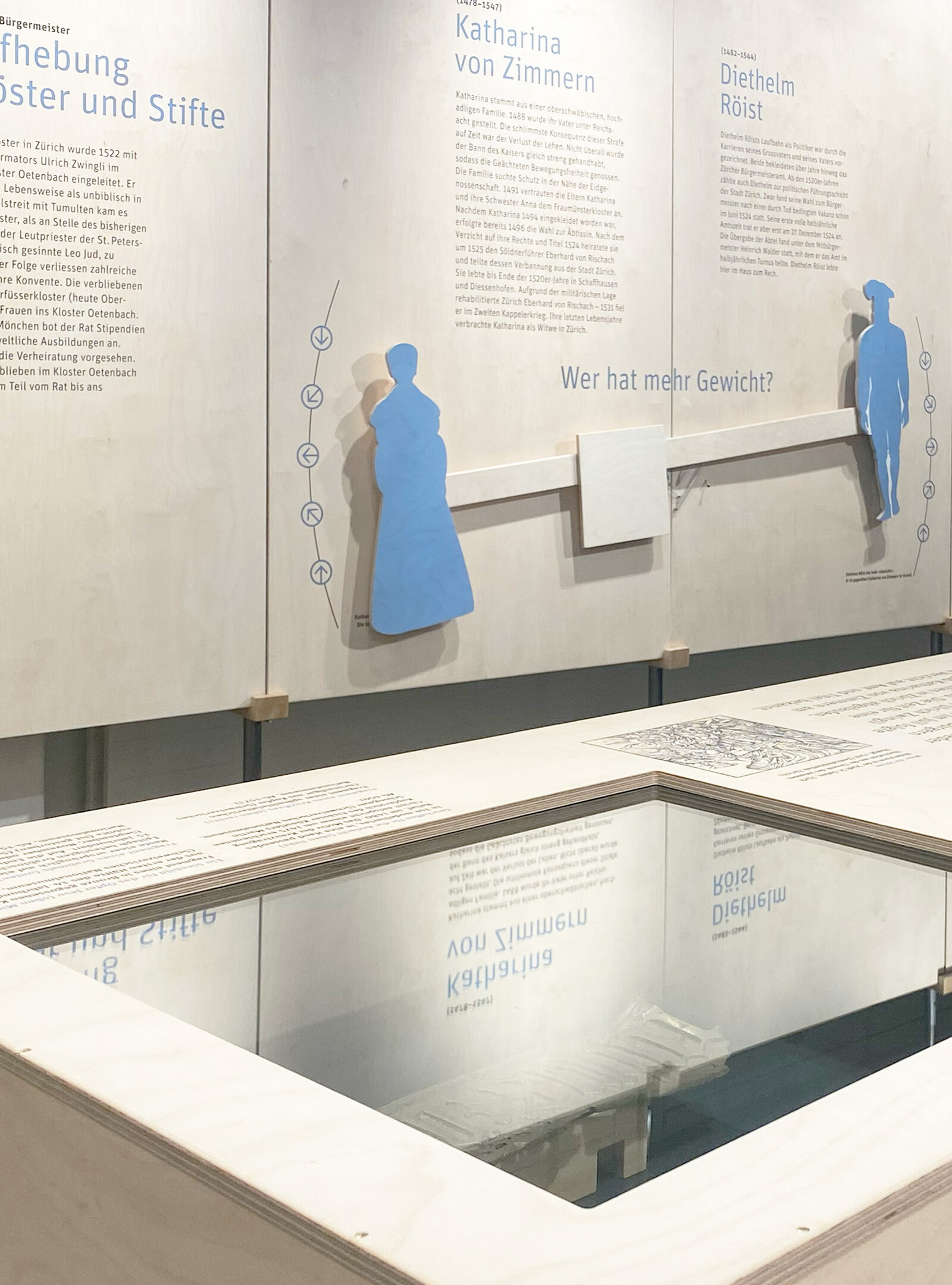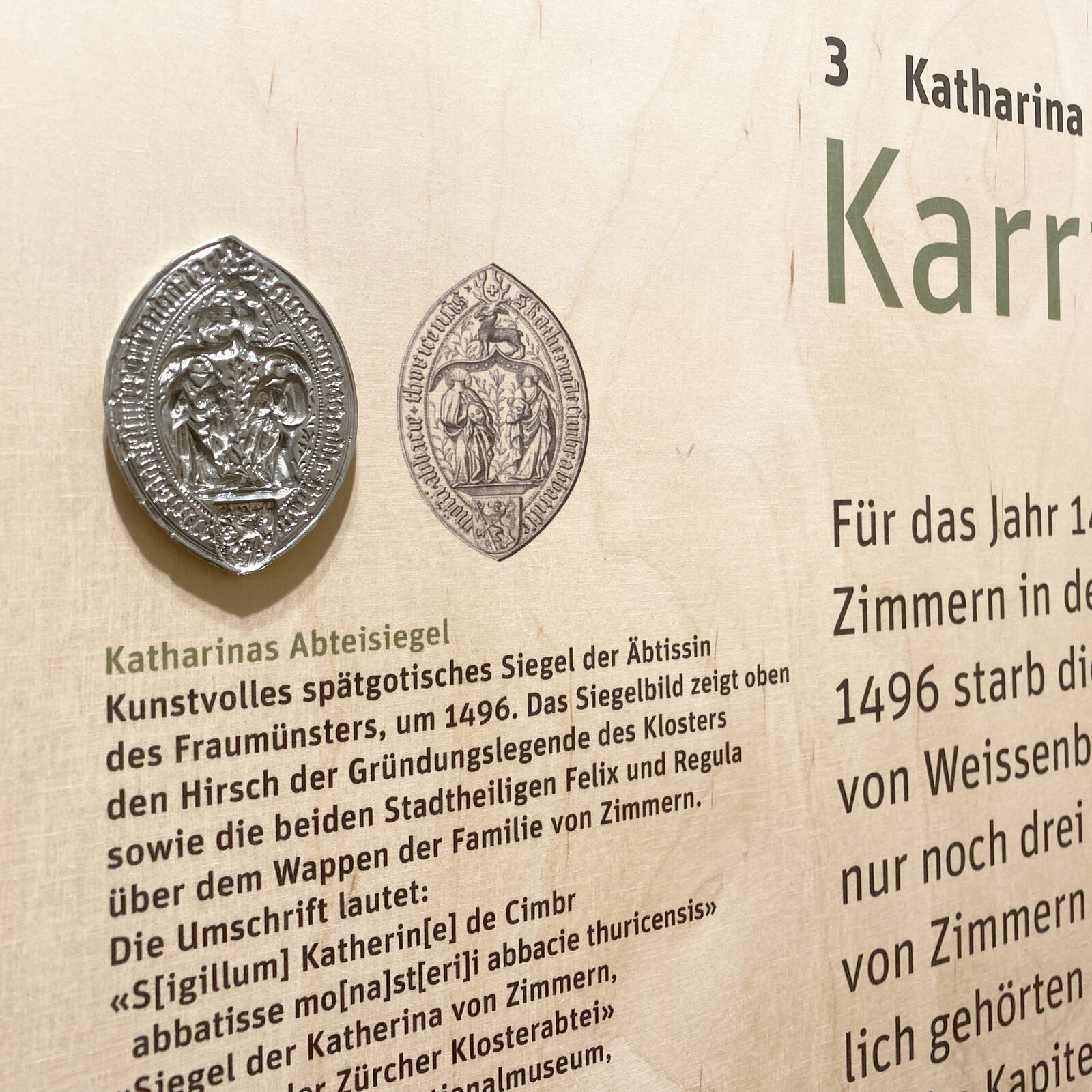 Am 8. Dezember 1524 übergab Katharina von Zimmern gegen die Zusicherung einer lebenslangen Rente die Fraumünsterabtei mit all ihren Privilegien, Rechten und Besitztümern dem Zürcher Rat. Die Ausstellung würdigt das bis in die heutige Zeit bedeutende Ereignis im Spiegel der Biografien der zwei Hauptbeteiligten Katharina von Zimmern und Diethelm Röist.