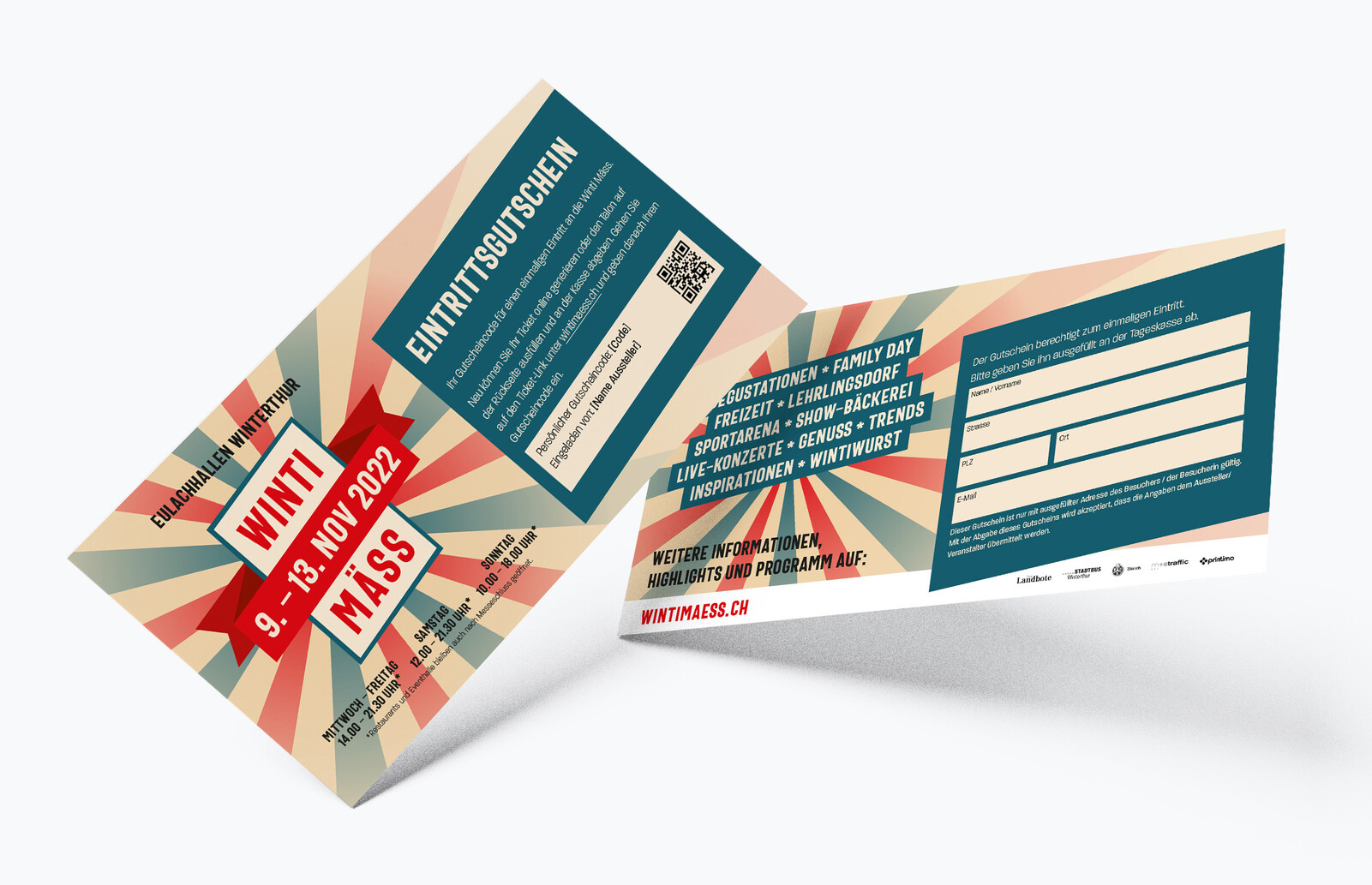 Nach zwei Jahren Pause startete die Winti Mäss 2022 in neuem Gewand. Mit dem verjüngten und sportlichen Design lädt DIE Publikumsmesse in Winterthur ihre rund 26000 Besucher zum Entdecken und Geniessen ein. Das Erscheinungsbild ist plakativ und leitet den Betrachter auf klaren Ebenen und mit optischen Effekten gezielt durchs Angebot.